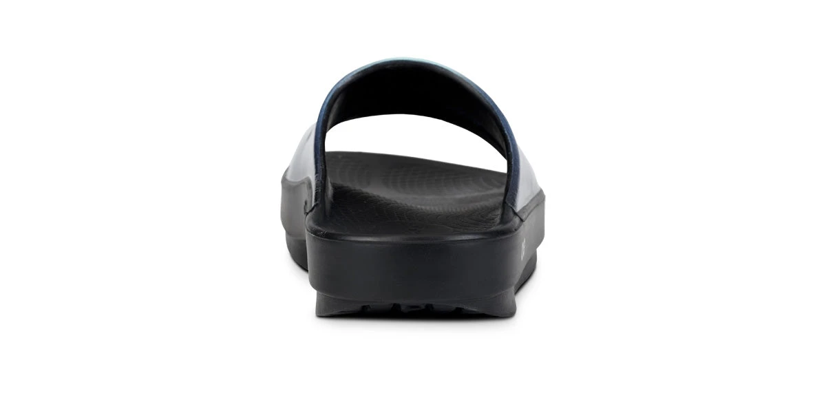 Luxe: Vibrant treatments and prints bring some extra fun and expression to OOFOS’ classic slide silhouette. Â